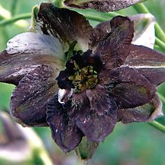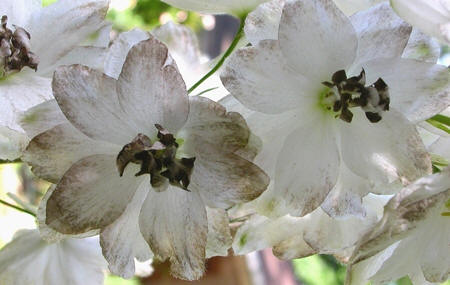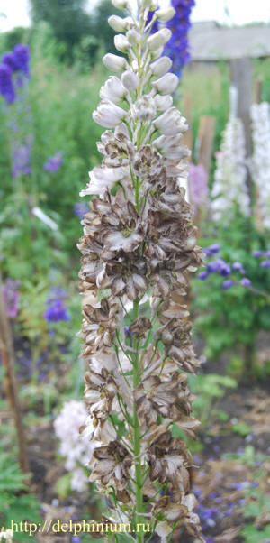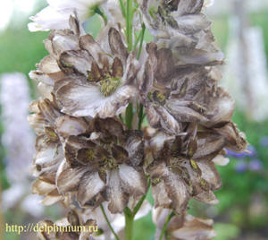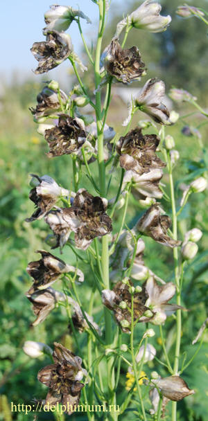 Среди наших дельфиниумов растения с чёрными цветками появляются регулярно, особенно среди белых сортов. Мы с досадой всегда наблюдали их, выбраковывали, уничтожали, считая это проявлением какой то болезни, хотя в литературе описание такой болезни найти нам не удалось. Недавно о таких цветках мы прочли на сайте Дэвида Бассеттаhttp://www.david.bassett.care4free.net/topics2/fascinat_florets_6.htm и выяснилось, что чёрная окраска - проявление рецессивного гена. Такая окраска обычна для глазков. Но бывает так, что ген, ответственный за окраску глазка распространяет своё влияние на лепестки и чашелистики. То есть это явление естественное, но редкое. У наших дельфиниумов степень почернения была разной, от тонкой каёмки по краю лепестков до почти чёрного, как бы обугленного цветка. В Англии на основе таких растений был выведен сорт 'Chocolate'.