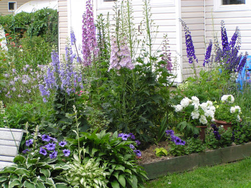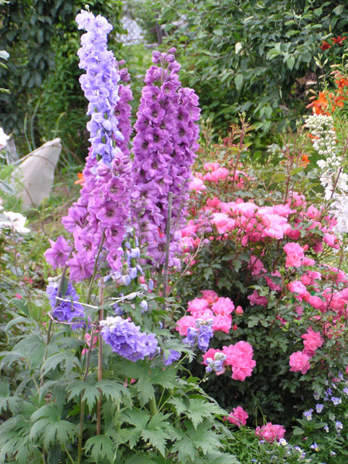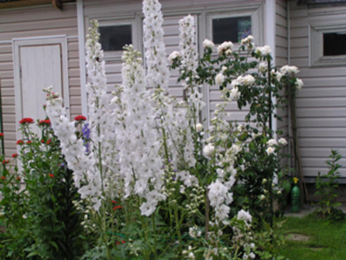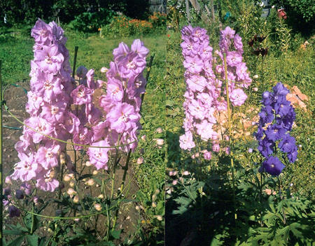 Здесь мы будем помещать фотографии, присланные нам любителями дельфиниума, иллюстрирующие примеры посадок дельфиниума в сочетании с другими садовыми растениями. Присылайте, хвастайтесь! Эту фотографию уголка сада с дельфиниумом нам прислала Валентина Дмитриевна Москаленко из Москвы. Этот дельфиниум она вырастила из семян.
