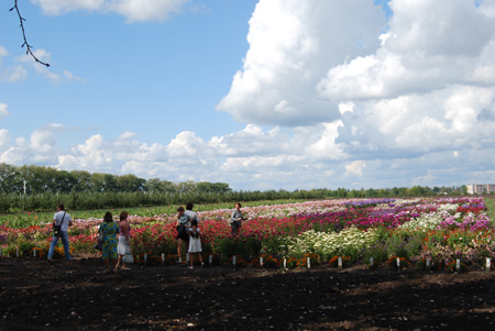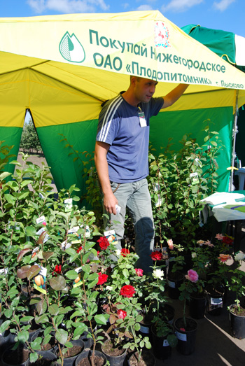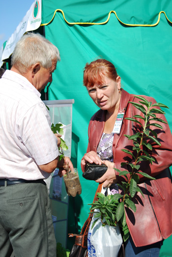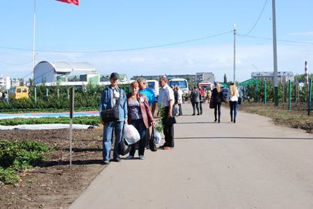 Тамбовская область нас встретила бескрайними полями подсолнухов и картошки, что составляло явный контраст с соседней Рязанской областью, где на полях выращивается как правило пшеница, редко ячмень и овёс, много брошенных земель. А на Тамбовщине явно ощущалось, что народ много трудится. Вдоль Волгоградской трассы много рыночков с домашним подсолнечным маслом, мёдом, картошкой, всяческими овощами, яблоками и грушами. Мичуринск – небольшой, очень симпатичный город с одноэтажными пригородами и старинными каменными особняками в центре. Когда мы въезжали, в городе ощущался праздник. На центральных улицах растяжки и плакаты с приветствиями к участкам и гостям Дня Садовода. Полицейские в парадной форме любезно показывают дорогу. Даже на здании Налоговой инспекции плакат «Налоговики приветствуют участников Дня Садовода!» (я чуть в бордюр не въехала). О том, что мы уже подъезжаем к НИИСу мы поняли по огромным толпам народа. Одни шли на выставку, другие уже шли, нагруженные всевозможными саженцами, горшками, цветами. Даже в Москве на выставке «Цветы» я не видела такого большого количества людей. Площадь у НИИСа гудела народом. Множество палаток с представителями различных плодоводческих хозяйств, питомников, конструкторских бюро, производителей садовой техники, поливочных систем, торгующих фирм с товаром для питомников и т.д. Множество образцов яблок, груш, малины, смородины, винограда и прочего и прочего. К сожалению в основном это были хозяйства из Тамбовской и Липецкой областей. Там же шло веселье, пели и танцевали самодеятельные артисты. Рядом – ярмарка, производители местные мичуринские, соседние липецкие предлагали свою продукцию, в основном декоративные растения в горшках, саженцы местного винограда (кстати в большом разнообразии), цветущие хризантемы. Вездесущие краснодарцы бойко торговали розами с голыми корнями и завядшими цветками, но зато дёшево. Саженцев плодовых почти не было, т.к. продажи их начинаются только после 15 сентября.