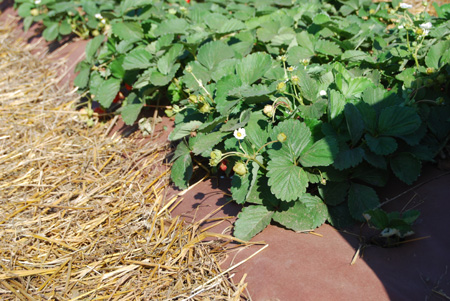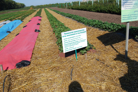 Экспериментальные посадки земляники, плодоносящей в год посадки. Сорта: Рина, Эльсанта, Ксима. Посажены в два ряда на приподнятых грядках, затянутых плотным нетканым материалом. Вдоль рядков проложены линии капельного полива. Междурядья заложены соломой. Плодоношение только началось. Вид растений очень здоровый. Урожайность, как гласила табличка, до 30 т с гектара. Впечатлило очень. Теперь будет искать литературу и по этим сортам и по новой для нас технологии.