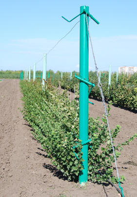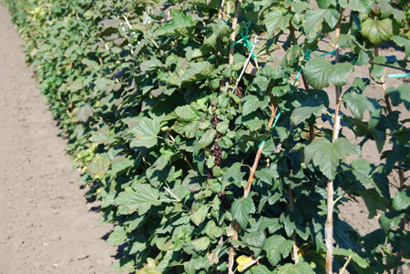 Экспериментальные посадки смородины на шпалерах. Что за сорт выяснить пока не удалось. Цвет ягод бордовый, вкус и строение кистей как у красной смородины. Сильные, совершенно здоровые кусты. Ветки подвязаны к шпалере так, что все ягодные кисти открыты солнцу, и кроме того это очень удобно для сбора. Вдоль рядков опять же линии капельного полива.
