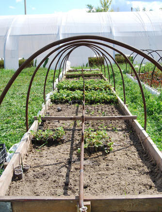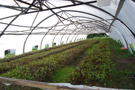 Недалеко от этих посадок мы обнаружили теплицу-череночник. Посещение её явно не было предусмотрено программой выставки, но мы не могли не заглянуть туда. Что увидели для себя нового? Во-первых, плёнка на теплице матовая непрозрачная. Такую раньше не видели. Это очень удобно. Мы, чтобы притенить череночник сверху покрываем ещё слоем плотного лутрасила. Черенки уже были явно укоренёнными, поэтому для вентиляции прямо в плёнке в нижней части теплицы были прорезаны большие окна. Значит плёнку они используют одноразово. Рядом с большой теплицей были расположены маленькие парнички, сейчас уже раскрытые, но их устройство нас очень заинтересовало, т.к. такие легко сделать практически всем. Деревянный короб заполнен песчано-торфяной смесью. Металлические дуги сварены в общий каркас. Посередине парничка проходит труба с форсунками для разбрызгивания воды. Наверняка полив включается автоматически с помощью реле времени (не уверена, что правильно назвала). В этих парничках не только укореняются черенки, но и подращивается рассада земляники в маленьких стаканчиках.