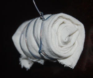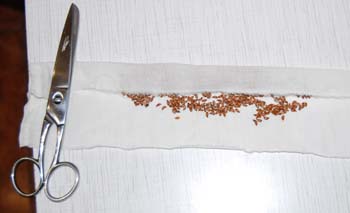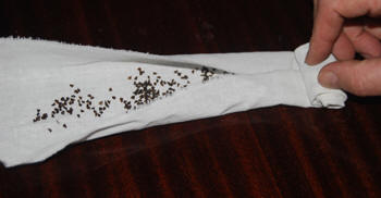 - Самый простой и экономичный способ, изобретённый нами и постоянно используемый. Из чистой белой тряпочки нарезаем длинные лоскуты размером 10х40 см примерно. Высыпаем на неё часть семян, распределяем равномерно по центральной части. Затем загибаем длинные края с обеих сторон, а с короткой закручиваем всё в рулончик. При этом семена оказываются внутри распределёнными по всей длине полоски ткани, и высыпаться никак не могут. До всего этого должна быть подготовлена этикетка. Рулончик с семенами обматывается проволокой этикетки несколько раз, так закрепляется этикетка. Затем аналогично подготавливаются рулончики всех семян, которые готовят к посеву. Готовится ёмкость, куда помещаются рулончики с семенами. На дно ёмкости наливается совсем немного воды. Все рулончики должны быть смочены водой, но не в коем случае не погружены в неё полностью. Иначе вода вытеснит весь воздух, и семена погибнут. Ведь прорастающие семена начинают очень интенсивно дышать. Ещё лучшим вариантом является применение мха-сфагнума. этот мох обладает способностью в 10 раз больше своего веса удерживать воду. Сильно увлажнённым мхом обкладываются рулончики и и укладываются в ёмкость (миску, банку и т.д.) . Далее всё это помещается в место с температурой 4-5 градусов. Это может быть холодильник, терраса дома. Всё время надо посматривать, чтобы рулончики были влажными.