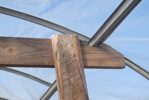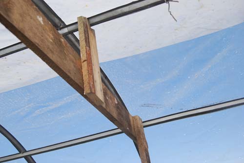 Из досок шириной 10 см мы сделали П-образные подпорки, которые упирались в каркас крыши в трёх точках. Четырёх подпорок на теплицу 3х6 м оказалось достаточно. Внизу под каждую "ногу" подпорки кладётся чурочка. Этим достигается то, что подпорка плотно держится в вертикальном положении. Весной она выбивается из-под "ноги", и подпорка легко удаляется из теплицы. Всё, проблема решена. Элементарно, дёшево, эффективно.