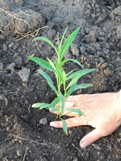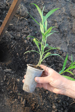 Время посадки выбираем сразу после дождя или в другое время, но в любом случае почва не должна быть сухой. Для изготовления лунок в земле мы используем старый металлический кол (лом) длиной где-то 130 см. На подготовленном для посадки участке прочерчиваются линии и по ним с помощью этого кола пробиваются отверстия в земле, верхняя часть которых раздвигается круговыми движениями кола. Работа эта, конечно, не для женщин. Расстояния между отверстиями зависят от культуры, но в среднем это 20 см. Горшочки с рассадой переворачиваются, рассада вынимается, у неё отлично сформирован ком, скреплённый корнями. Затем рассада опускается в лунку и прижимается землёй. Примечательно, что форма кома с корнями полностью соответствует размеру отверстия. Единственное, глубина отверстия, проделанного колом, всегда больше высоты земляного кома рассады, поэтому на дно лунки мы обязательно сыпем немного земли.
