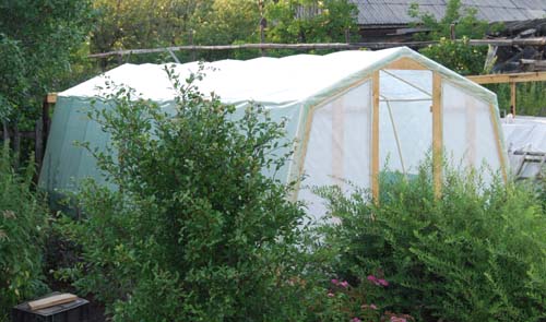6. Торцы закрываются конструкцией из досок, которая покрывается нетканым материалом, позволяющим улучшить воздухообмен в теплице. Сама же конструкция из досок придаёт жёсткость всей теплице. В передней части делается дверной проём.