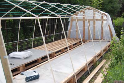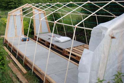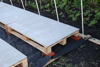 4. Строятся стеллажи. Мы использовали транспортные поддоны 1 х 1,5 м (мы их сделали сами, но можно и купить готовые), на которые крепится лист плоского шифера 1 х 1,5 м с помощью боковых реек. Чтобы стеллажи не гнили, по углам под них ставятся кирпичи. Готовые стеллажи устанавливаются в два ряда с проходом между ними.