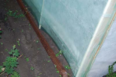 8. Покрытие теплицы двухслойное: на каркас сначала кладётся нетканый материал (плотность 60), он позволяет рассеять солнечные лучи и снизить температуру в теплице. Сверху натягивается плёнка. Мы уже несколько лет используем термосветостабилизированную плёнку Десногорского завода плотностью 150 мкм и шириной 6 м (3 м рукав). При заявленном гарантийном сроке службы в 3 года, у нас она служит уже 5 лет на нескольких теплицах и до сих пор не имеет признаков разрушения. Сверху плёнка крепится капроновым шпагатом, который перебрасывается сверху поперёк теплицы и снизу привязывается за проложенный вдоль теплицы тяжёлый старый стальной уголок.